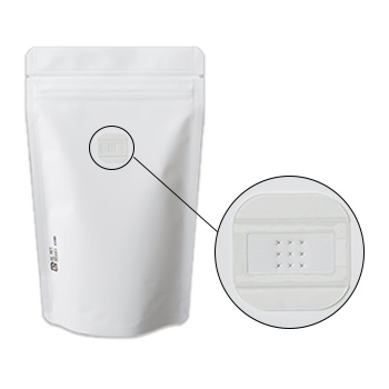 「ガス抜きバルブ取り付け加工」とは既製品袋にガス抜きバルブを取り付けることができます。 袋の内面に取り付けたバルブの働きで袋内部に発生したガスを袋の外に放出し、 外部からの酸素の侵入を防ぎます。袋には小さな穴が開くだけで、絵柄にはほとんど影響がありません。