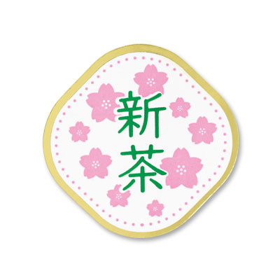 かわいらしい花が散りばめられ、文字と枠に箔押加工を施した、菱型の新茶シールです。