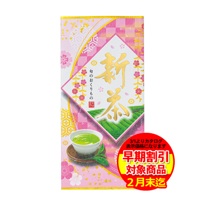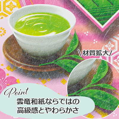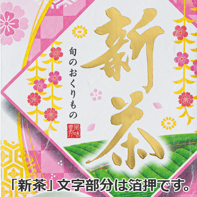 和柄をあしらった華やかなデザインの新茶袋です。雲竜和紙を使用した材質で「新茶」の文字は箔押し加工を行い高級感もあります。