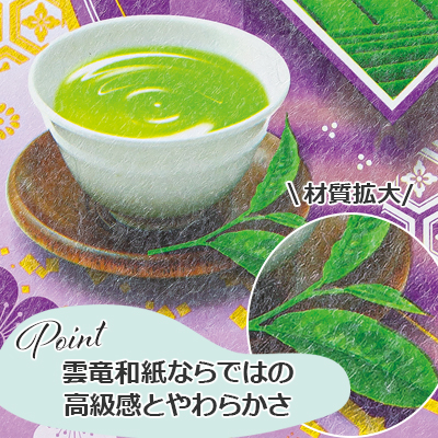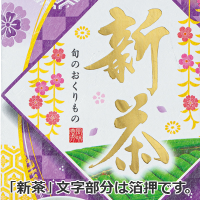 和柄をあしらった華やかなデザインの新茶袋です。雲竜和紙を使用した材質で「新茶」の文字は箔押し加工を行い高級感もあります。