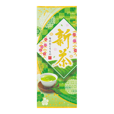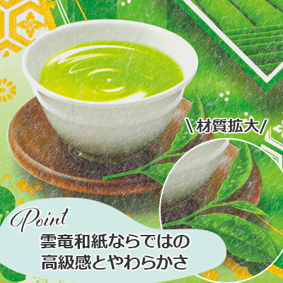 和柄をあしらった華やかなデザインの新茶袋です。雲竜和紙を使用した材質で「新茶」の文字は箔押ではありません。