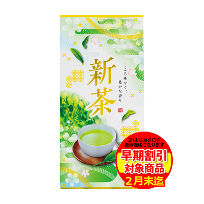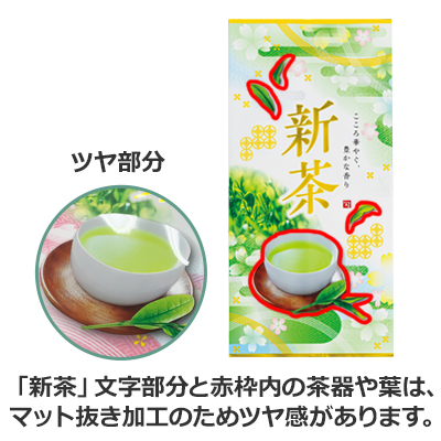 全体にマット加工を施していますが、新茶文字と湯呑はマットを抜いてますので光沢があります。新茶の爽やかさと和モダンなイメージを組み合わせたデザインです。