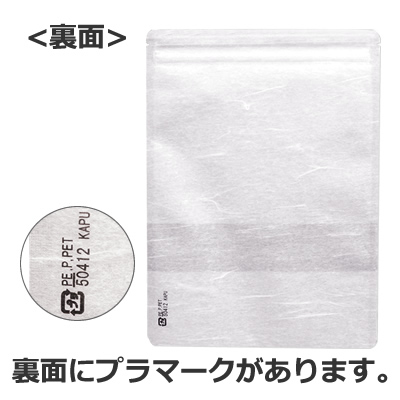 雲竜和紙タイプのチャック付平袋です。ガスバリア性のあるフィルムを使用し、内層には粘りのあるLLフィルムを使用しています。