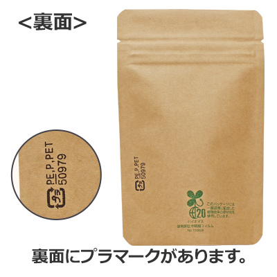 この商品は、構成しているフィルムの一部に植物由来の原材料が約20%含まれている「バイオマスフィルム」を採用しています。袋の裏面にはバイオマスマークが印刷されています。自立するスタンド袋です。材質の違いは、サンプルでご確認ください。※表面のクラフト紙は、未晒しのため風合いに濃淡が生じます。