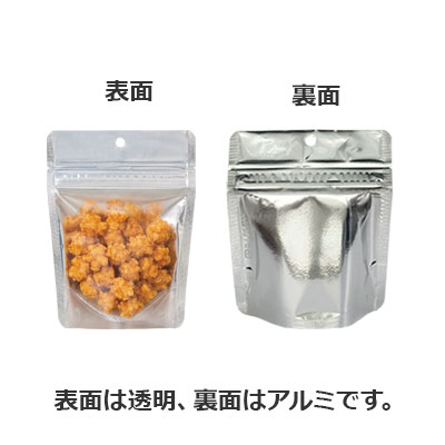 | 材質 | 本体: | 表:AS透明蒸着PET12/PE15/ASLL50 裏:アルミ蒸着PET12/PE15/ASLL50 合計:77ミクロン |