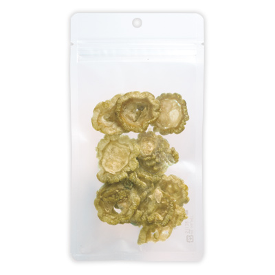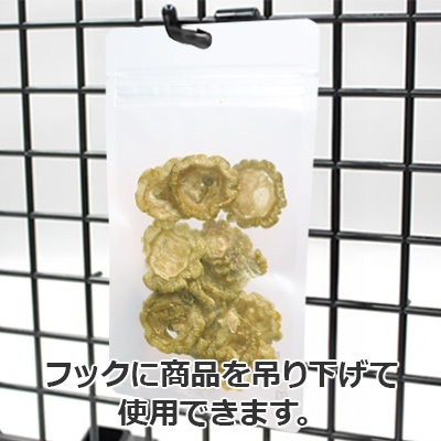静防性、防湿性、ガスバリア性のある透明フィルムと耐久性のあるナイロンフィルムを使用した袋です。また気密性に優れ、中身が見え保存性が必要とされる場合に適していますが遮光性はありません。フック用の穴付き袋です。商品を吊り下げて使用できます。