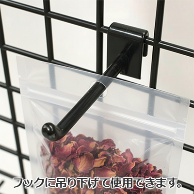 静防性、防湿性、ガスバリア性のある透明フィルムと耐久性のあるナイロンフィルムを使用した袋です。また気密性に優れ、中身が見え保存性が必要とされる場合に適していますが遮光性はありません。フック用の穴付き袋です。商品を吊り下げて使用できます。