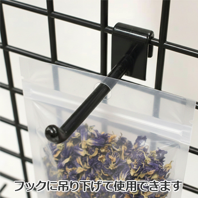 静防性、防湿性、ガスバリア性のある透明フィルムと耐久性のあるナイロンフィルムを使用した袋です。また気密性に優れ、中身が見え保存性が必要とされる場合に適していますが遮光性はありません。フック用の穴付き袋です。商品を吊り下げて使用できます。