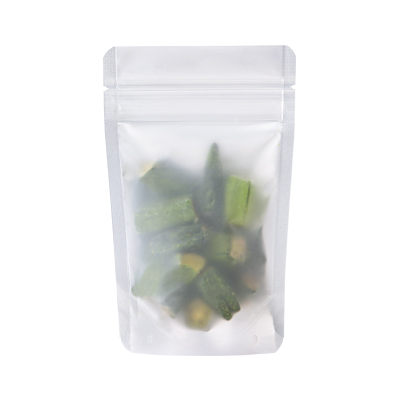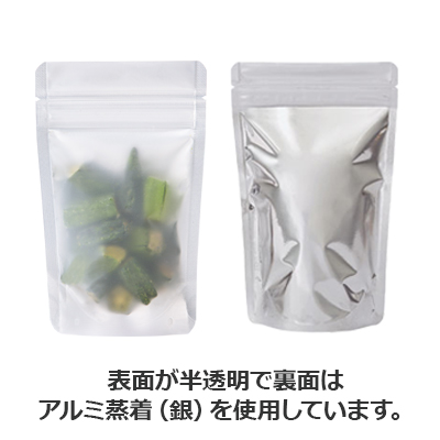 表面は半透明で裏面にはアルミ蒸着を使用したチャック付スタンド袋です。マットタイプで中身が薄っすら透けて見えます。油脂が付着すると指紋が見えやすい材質ですのでご注意ください。