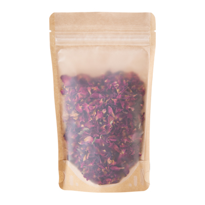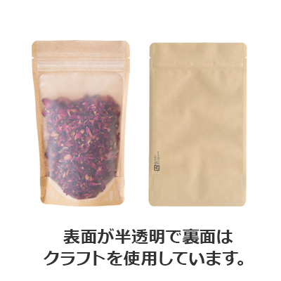 表面は半透明で裏面にはクラフト紙を使用したチャック付スタンド袋です。マットタイプなため表からは中身が薄っすら透けて見えます。油脂が付着すると指紋が見えやすい材質ですのでご注意ください。※クラフト紙は、未晒しのため風合いに濃淡が生じます。