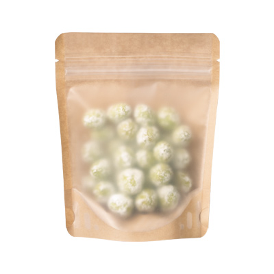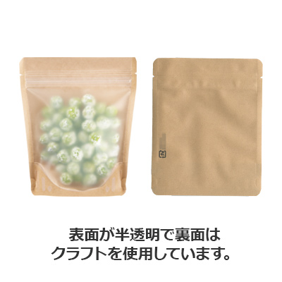 表面は半透明で裏面にはクラフト紙を使用したチャック付スタンド袋です。マットタイプなため表からは中身が薄っすら透けて見えます。油脂が付着すると指紋が見えやすい材質ですのでご注意ください。※クラフト紙は、未晒しのため風合いに濃淡が生じます。