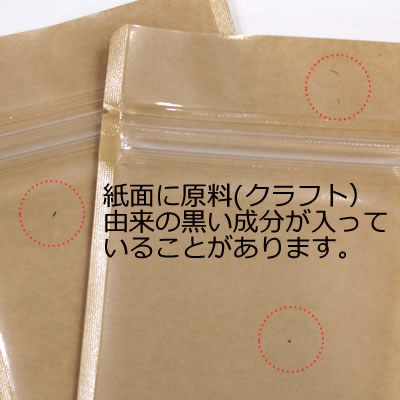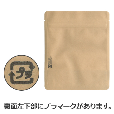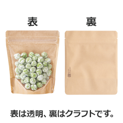 表面は透明で裏面にはクラフト紙を使用したチャック付スタンド袋です。表からは裏面のクラフト紙が透けて見えます。ガスバリア性の機能を持ったフィルムを使用しています。※表面のクラフト紙は、未晒しのため風合いに濃淡が生じます。