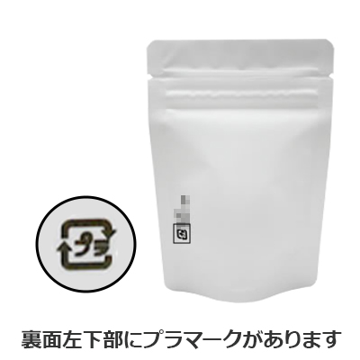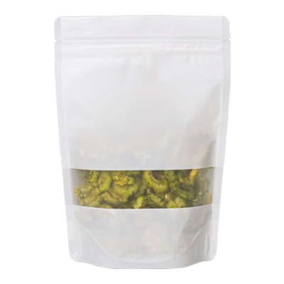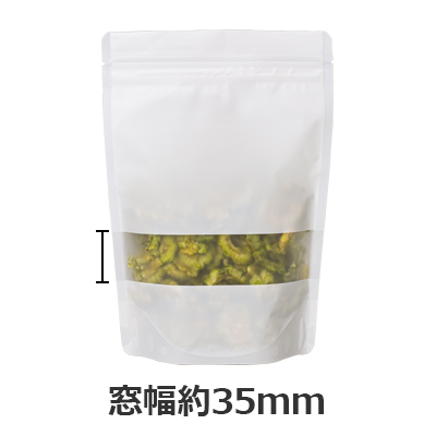 全体が清潔感のある白色で、表面の一部が半透明の窓になったチャック付スタンド袋です。マットニス加工を施しておりますので、表面のツヤが消え上品な仕上がりです。強度面などご利用上の適性はサンプルにてご確認ください。