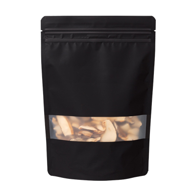 全体が高級感のある黒色で、表面の一部が半透明の窓になったチャック付スタンド袋です。マットニス加工を施しておりますので、表面のツヤが消え上品な仕上がりです。強度面などご利用上の適性はサンプルにてご確認ください。