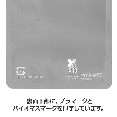 底部分がフラットになっており立体的な形状なため、ディスプレイ効果も期待できアピール度が高い商品です。マットニス加工を施しておりますので、表面のツヤが消え上品な仕上がりです。印刷に使用したインキには、環境に配慮した植物由来原料を10%含むインキを一部、使用しています。袋の裏面には、リサイクル識別マーク・バイオマスマークを印字しています。