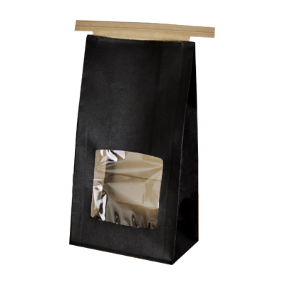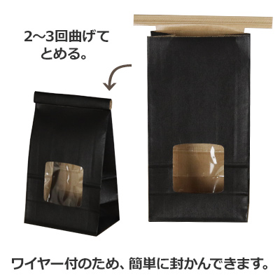クラフト紙に黒ベタを印刷したワイヤー付の袋です。ワイヤー付の為、簡単に封ができます。窓部分がありますので中身を見せる商品に最適です。底は密閉されておりません。粉末などを直接入れるとこぼれる事がございます。粉末や粒の小さいものを入れる場合や、バリア性が必要とされる内容物にご使用の際は、中袋のご利用をご検討ください。黒色のベタ印刷していますので、色むらが発生する場合がございます。擦れたり濡れたりしますと袋の色が衣類等に付着することがございますのでご注意ください。