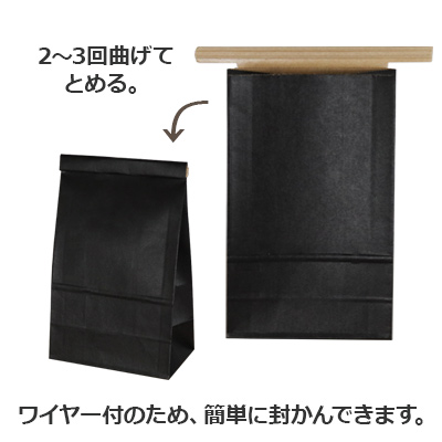 クラフト紙に黒色を印刷したワイヤー付の袋です。ワイヤー付の為、簡単に封ができます。底は密閉されておりません。粉末などを直接入れるとこぼれる事がございます。粉末や粒の小さいものを入れる場合や、バリア性が必要とされる内容物にご使用の際は、中袋のご利用をご検討ください。黒色のベタ印刷していますので、色むらが発生する場合がございます。擦れたり濡れたりしますと袋の色が衣類等に付着することがございますのでご注意ください。
