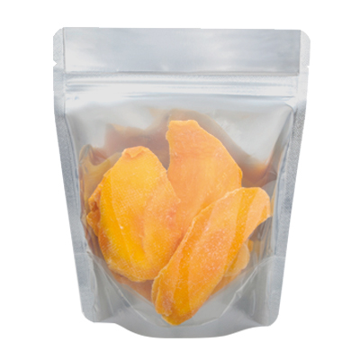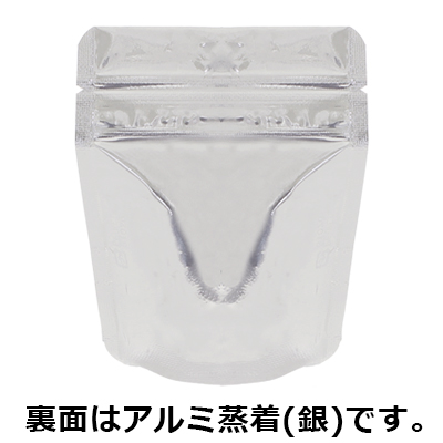 オモテ面は透明蒸着で裏面はアルミ蒸着フィルムです。やわらかい材質で静防性、防湿性、ガスバリア性があるフィルムを使用した袋です。