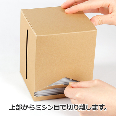 ギフト箱としても利用でき、正面下部のミシン目を開けると、中身の小袋が手軽に1つずつ取り出せます。ご家庭やお店のレジ横などで使える便利なカートンです。