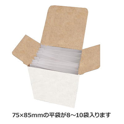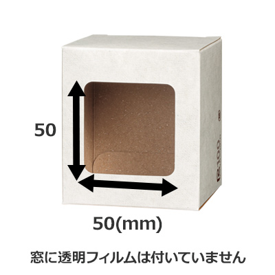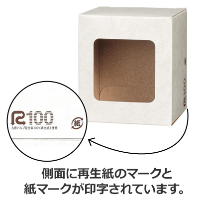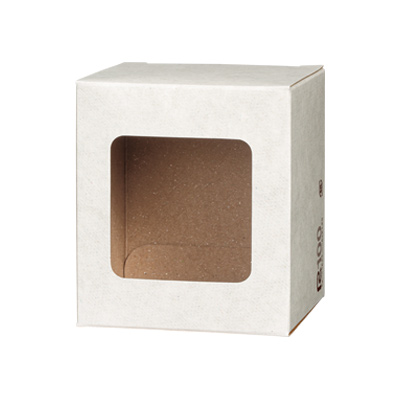 窓付コンパクトサイズのキャラメル型カートンです。窓にフィルムはありません。表面はオフホワイト・アイボリー系の色調で紙パックなど液体飲料容器古紙を、内面はクラフト調で中層と併せて一般古紙を使用しております。古紙を使用しているため、色の濃淡が生じたり古紙由来の成分が粒状に見える場合があります。古紙100%の紙を使用している文言を印刷しています。