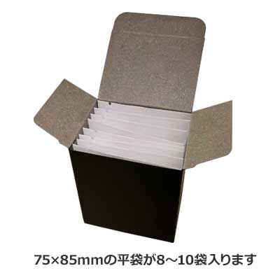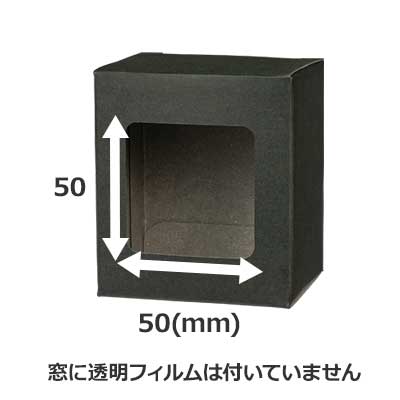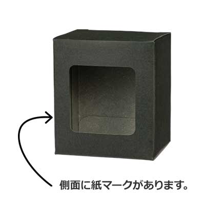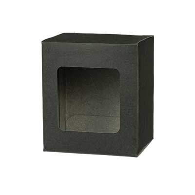 窓付コンパクトサイズのキャラメル型カートンです。窓にフィルムはありません。少しくすんだ色合いの黒色の箱です。