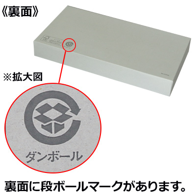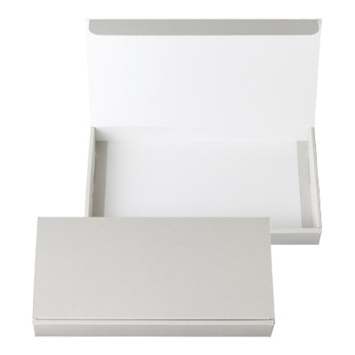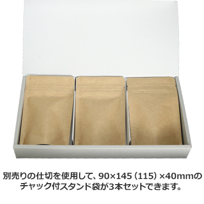 FSC規格で認証された古紙(回収原材料)を使用した、明るいグレー色のギフトケースです。フタと底は一体の形状で、内側は清潔感のある白色です。古紙を使用しているため、色の濃淡が生じたり古紙由来の成分が粒状に見える場合があります。ご了承ください。別売りの中仕切を使うことで90×145(115)×40mmのチャック付スタンド袋が3本セットできます。