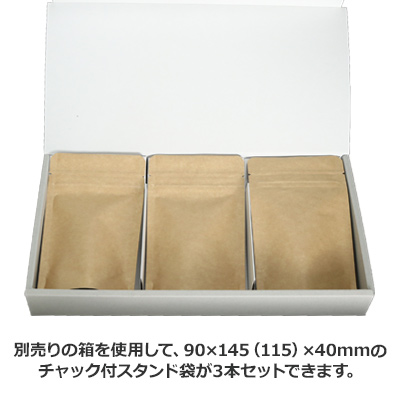 90×145(115)×40mmサイズのチャック付スタンド袋を3本セットできる中仕切です。