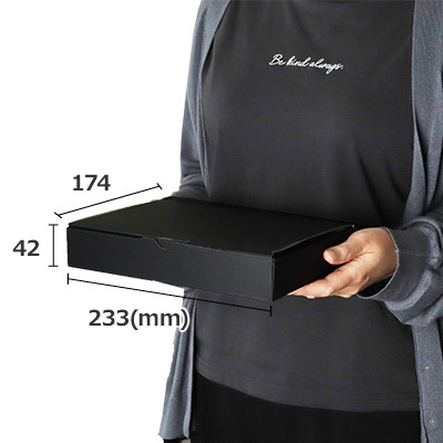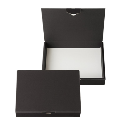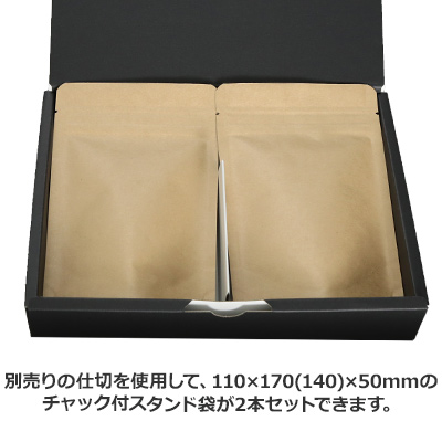 フタと底が一体になったギフトケースです。外側は高級感のある黒色で、内側は清潔感のある白色の仕様になっています。様々な用途にお使いいただけます。別売りの仕切を使うことで110×170(140)×50mmのチャック付スタンド袋が2本セットできます。