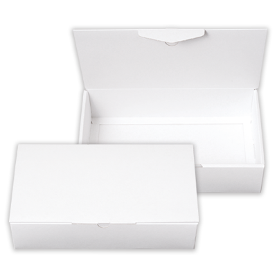 FSC規格で認証された古紙(回収原材料)やその他の管理された原材料を使用した、白色のギフトケースです。フタが2重構造で厚みがあり重厚感があります。