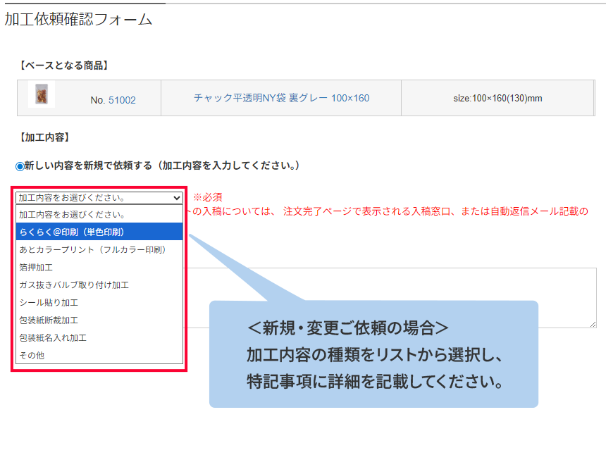 「オリジナル商品一覧」にない商品(新規または、過去2年以上ご注文されていない加工品)をご依頼の場合は、