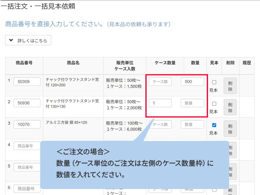 - ケース単位でのご注文は、「ケース数量枠」に数値を入力してください。
