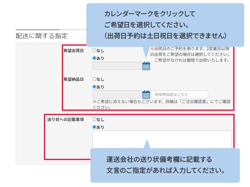 配送・出荷に関するご希望をご指定ください。各選択肢は「あり」を選択して入力枠を開いてください。