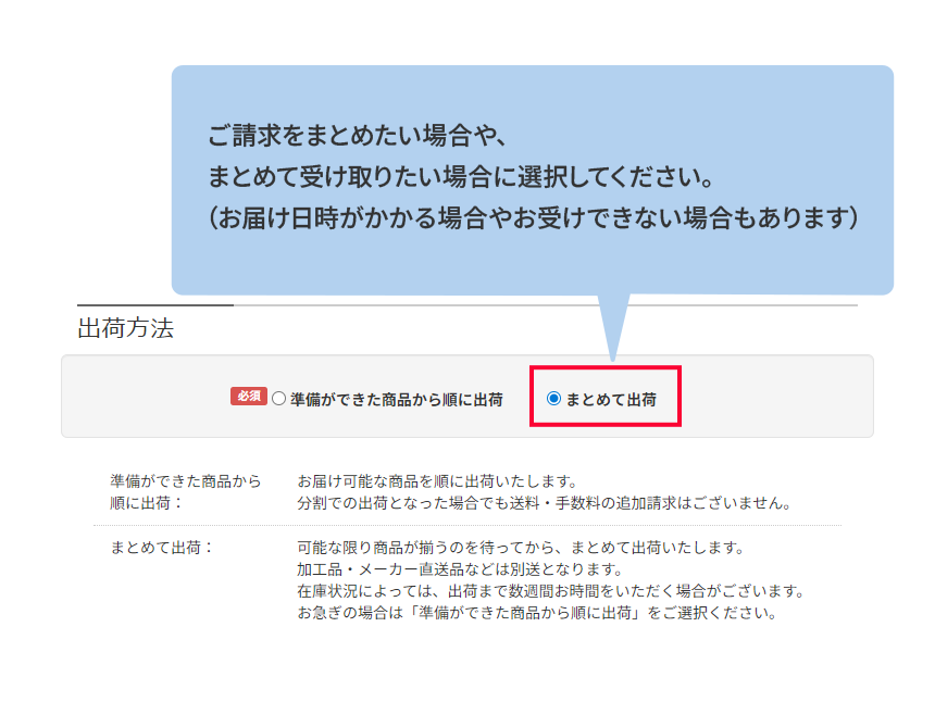 1つの領収証を希望される場合は、ご注文時にまとめて出荷を選択してください。