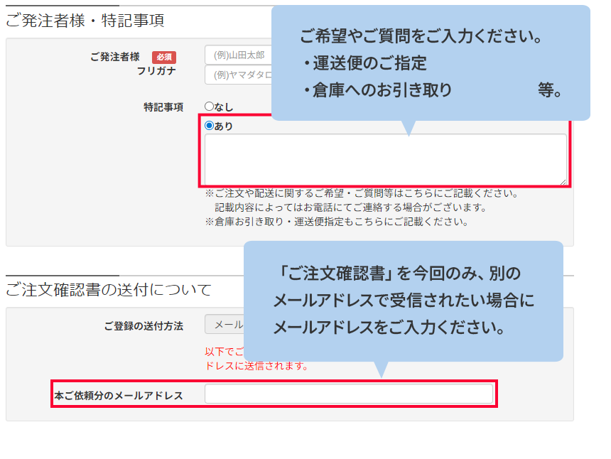 - 「ご注文確認書」の送付先にご希望がある場合はご入力ください。