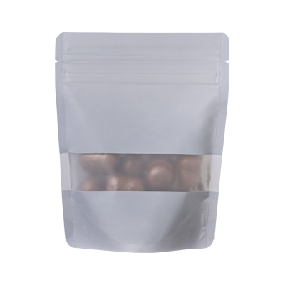 表裏がグレーの印刷で、オモテ面の一部が半透明の窓になったチャック付スタンド袋です。